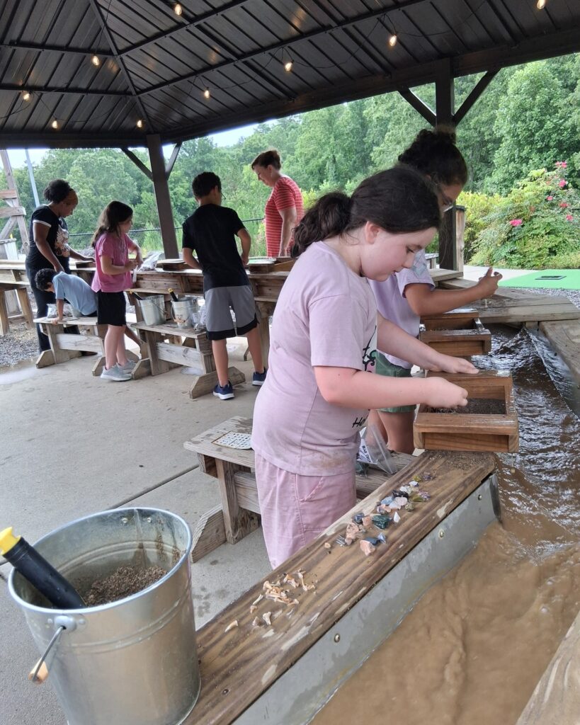 Covered is better than you’d think. At Bear Creek Adventures, the sluice is covered, which matters more than it sounds. A shaded sluice on a warm afternoon in the Blue Ridge makes the whole experience more comfortable, and means a little summer rain won’t cut your trip short.